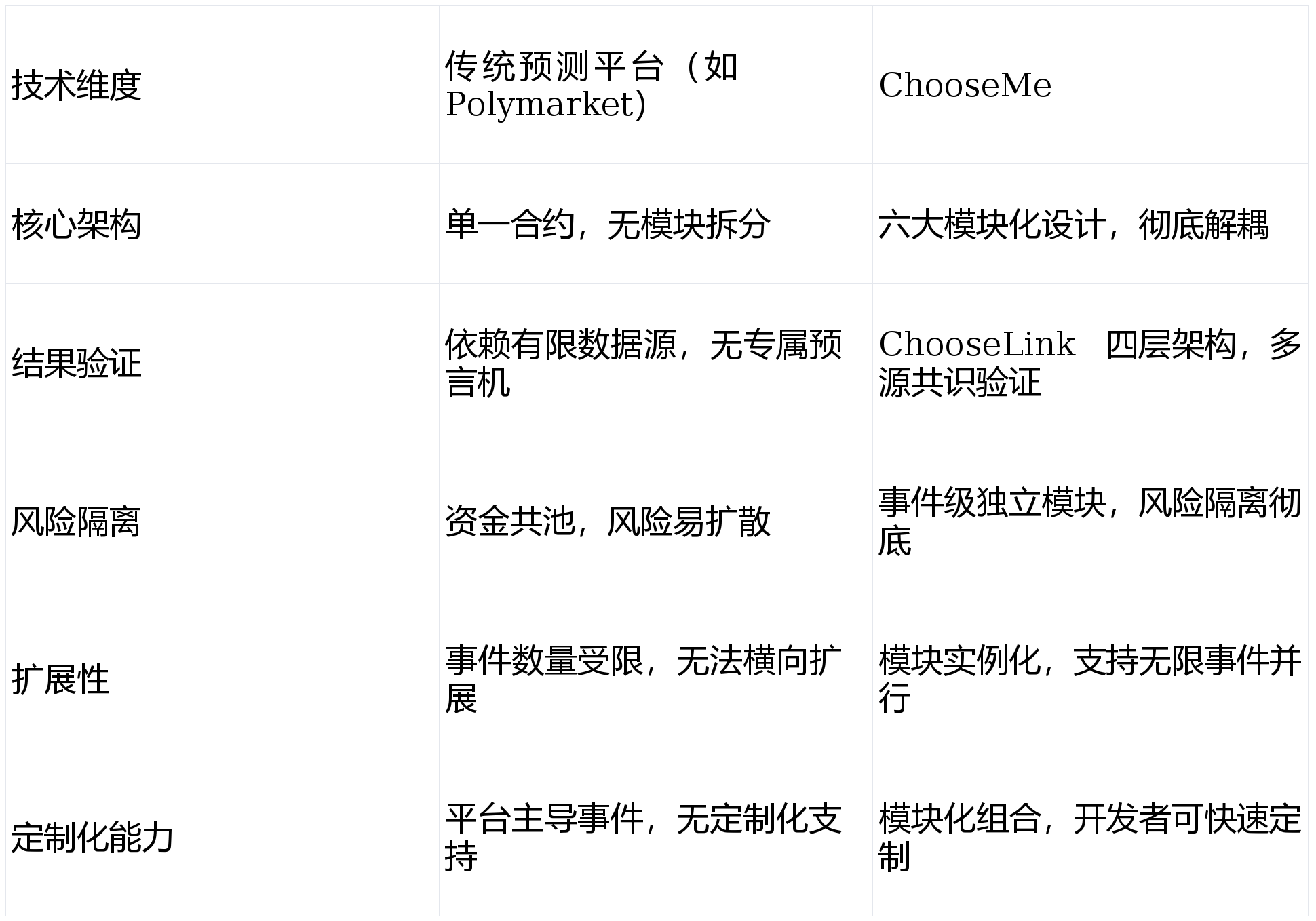 ChooseLink 做为专为预测市场设想的 “引擎”,不参取订价取买卖;完全处理了这一行业。而 “去核心化 Oracle + 模块化合约” 的手艺组合,无需从零开辟底层系统。而保守预言机更擅长尺度化金融数据。
